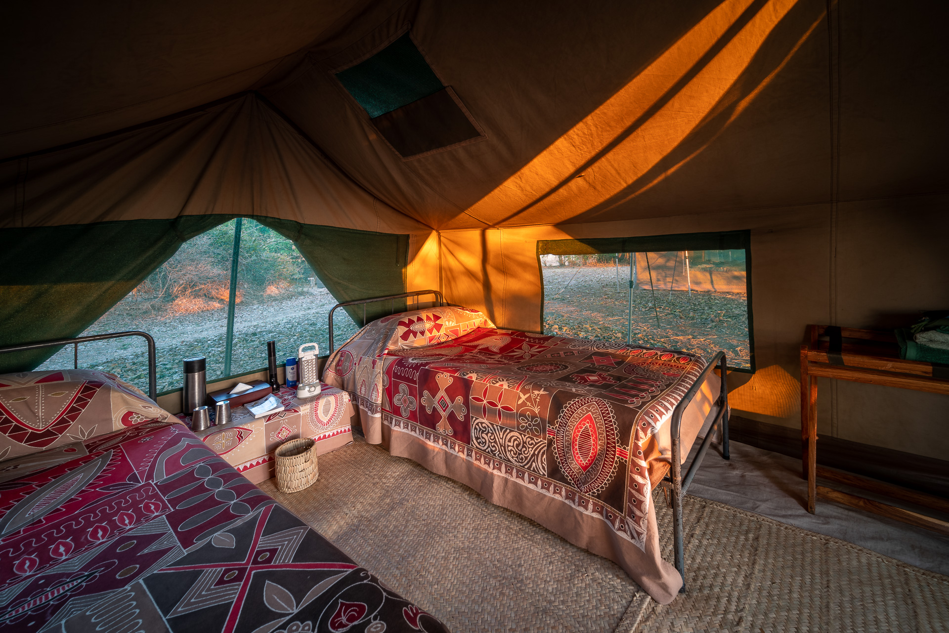 After an early breakfast, you will be heading north to start your walking mobile which has become known as THE wilderness experience of the South Luangwa. Your drive is some 90kms to the Mupamadzi River along a bush road, through remote parts of the park. You arrive in camp for lunch around mid-day. The camp is already set up for your arrival with well-equipped walk-in tents. The shower is under a tree and the toilet is a long drop with a wooden throne. Enjoy a relaxing siesta after lunch, before tea and going for a walk around camp in the afternoon, to return for sundowners and dinner in the open under the stars!